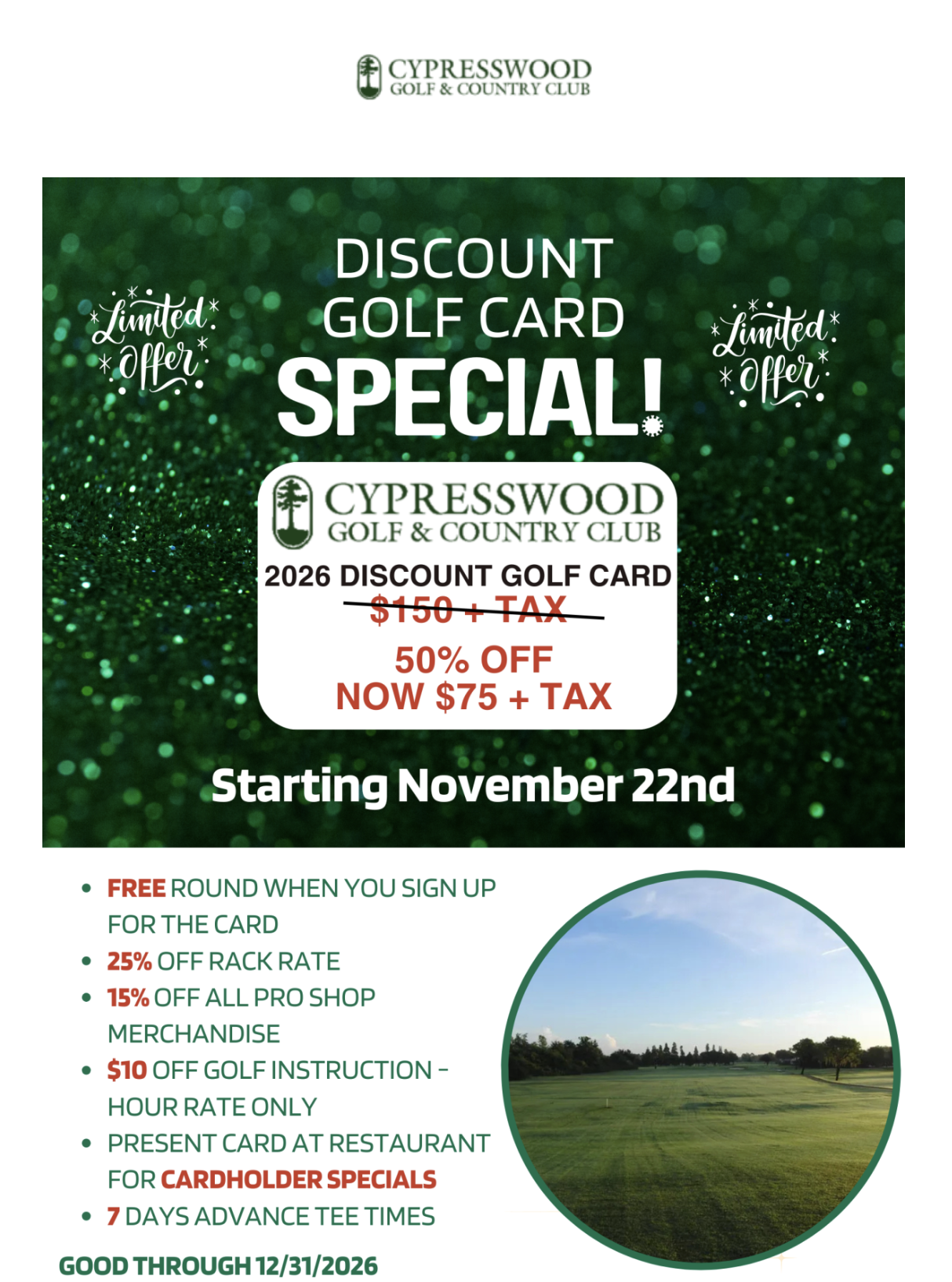 Please select this item to reserve the 2026 Cypresswood Discount Card. You will pay for the Discount Card upon your arrival in the golf shop.