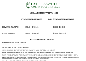 - Proof of Cypresswood residency is required to receive homeowner discount.